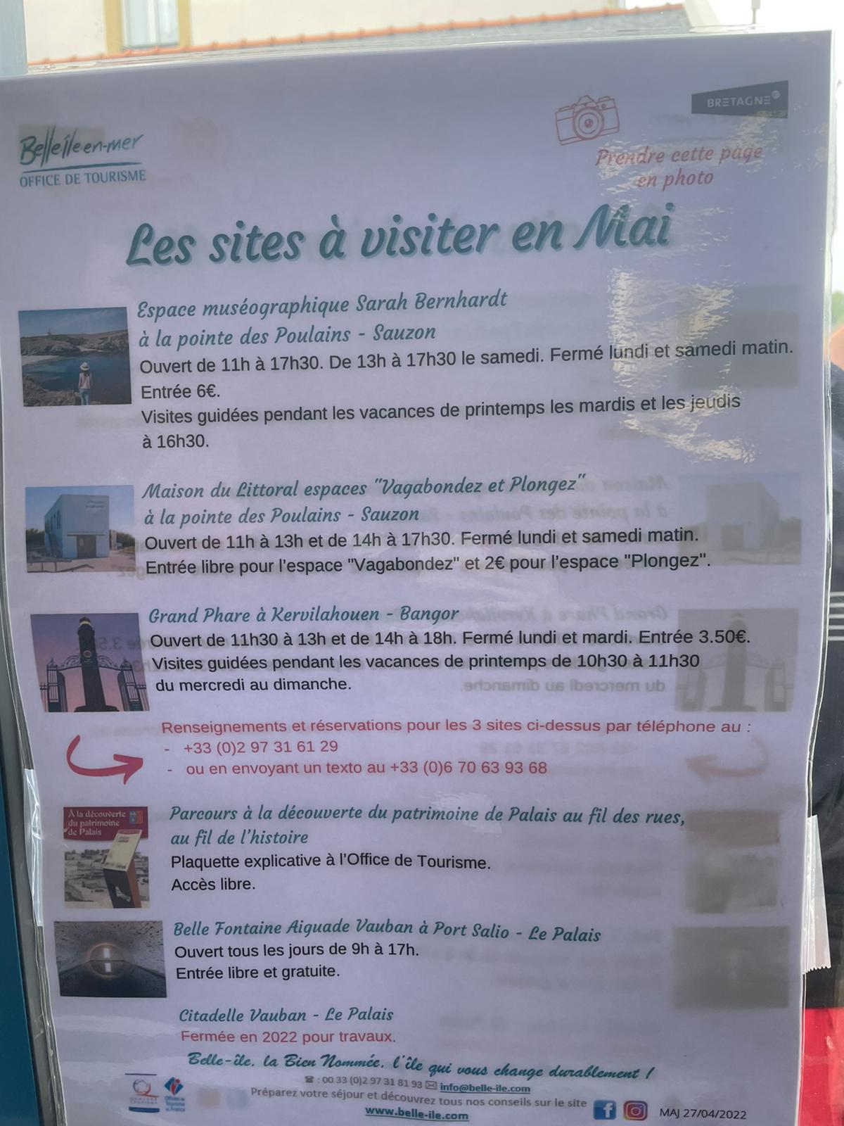 Ma critique ne va pas vers l'office du tourisme,mais vers la gestion de l'île en matière de randonnée pédestre. Le sentier côtier est très mal balisé,pas un seul point d'eau sur tout le parcours,des fougères de plus de 1m50 de haut nous empêchant de bien suivre le chemin (Je suis tombé dans un petit ravin remplit de ronces et d'orties,à cause d'un trou caché par les herbes non débroussaillées). Surtout ne mettez pas cela sur le dos du Covid,car on peut entretenir le sentier tout en respectant les gestes barrières. De plus les routes sont très mal agencées. Pas trottoirs ou pistes cyclables pour accéder au camping. Vraiment dangereux. De plus le reseau internet est vraiment lamentable. Dommage le panorama est magique et l'île regorge de restos sympas. En espérant que vous ferez remonter ces doléances à qui de droit. Cordialement.